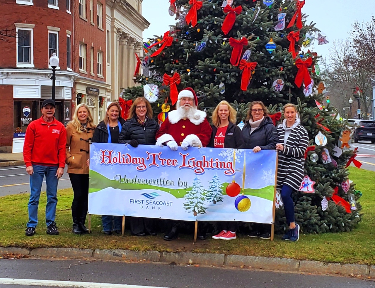 Pictured in the photo: Holiday Events Committee Chair Norman Sanborn; Tatjana Simon, Northeast Credit Union; Candace Rowell, Service Credit Union; Sharla Rollins, First Seacoast Bank; Santa; Carrie