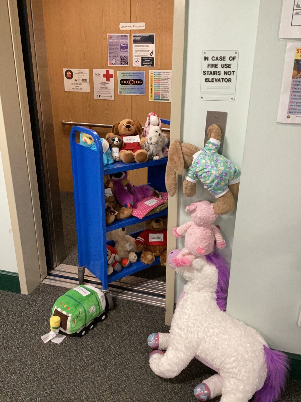 With the library closed for the scheduled pick-up day, librarians ensured that the 36 stuffed friends had an enjoyable time exploring the premises. Activities ranged from games like tag and hide-and-seek to riding in the elevator. Before retiring for the night, Children’s Librarians Jenn and Christina shared bedtime-themed stories.
